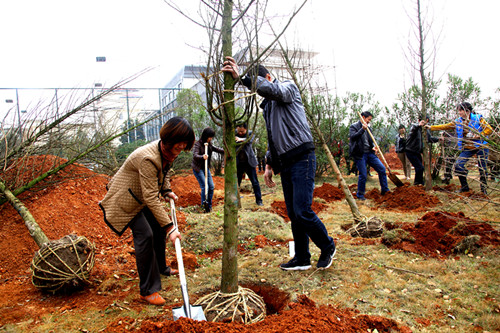 早春的梨温高速“生态园”一派绿意葱葱。上午10点30左右,在省高速集团工会副主席谢泓,公路开发总公司党委副书记刘楚有,梨温公司在家领导的带领下,集团所辖各路段单位工会干部及梨温公司机关人员70多人,一起来到该大院篮球馆后面一处空地种树。干部职工你铲土,我浇水,热火朝天的干了起来,一小时左右,一排排挺拔秀美的树苗展现在大家眼前。
