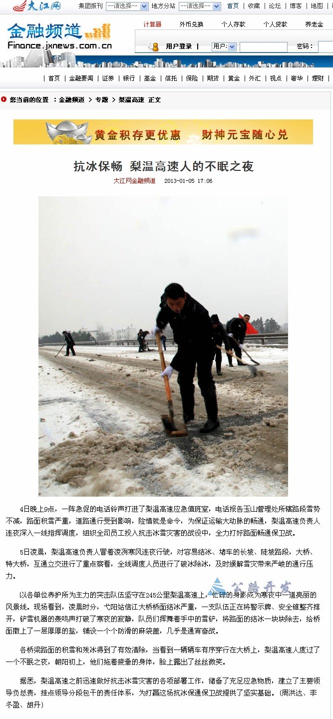【媒体聚焦抗冰雪】大江网金融频道:抗冰保畅梨温高速人的不眠之夜