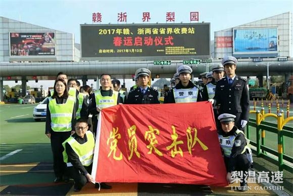 1月13日,全国春运的第一天,梨温高速赣浙界梨园站联合浙赣收费所、赣浙两省交警等部门,在梨园站收费广场开展春运启动仪式,拉开为期40天的春运保畅大幕。