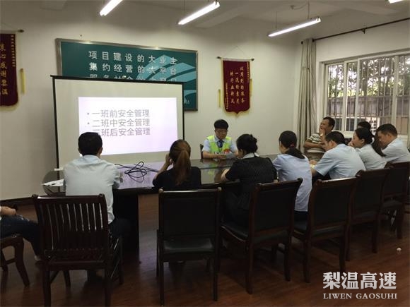 收费一班的班长杨火金结合本月安全生产月活动为该站同事讲了一堂《收费站班组安全管理》课程。课程的主要内容结合本职工作围绕班前、班中、班后的安全管理进行讲课。通过这堂课,既提高了班长的业务水平也使在座的员工体会到安全生产的重要性。