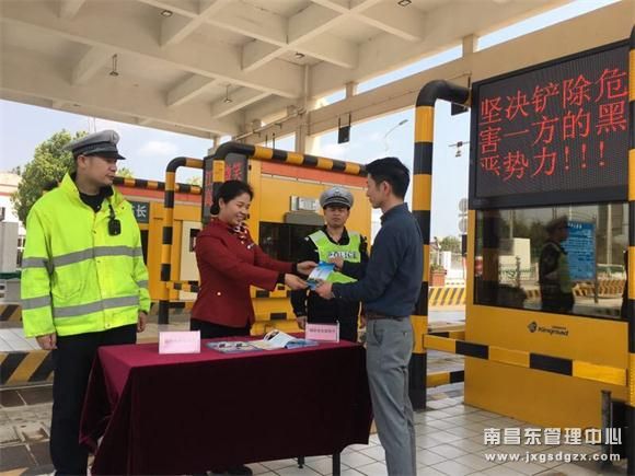 鹰潭所、玉山所、赣浙所及罗湖站等单位联合属地高速交警、路政等单位,积极开展扫黑除恶专项斗争宣传活动,先后在收费广场搭建小型宣传咨询台、发放宣传单、悬挂横幅及LED电子屏滚动播放标语等形式,向过往司乘人员讲解扫黑除恶专项斗争知识,重点围绕高速公路扫黑除恶专项斗争七项重点内容进行宣传。