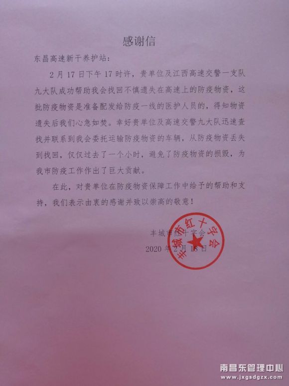 2月19日上午9时许,江西省高速集团南昌南管理中心新干养护站收到一个不“疫”样的邮件,此邮件是一封来自丰城市红十字会的感谢信。