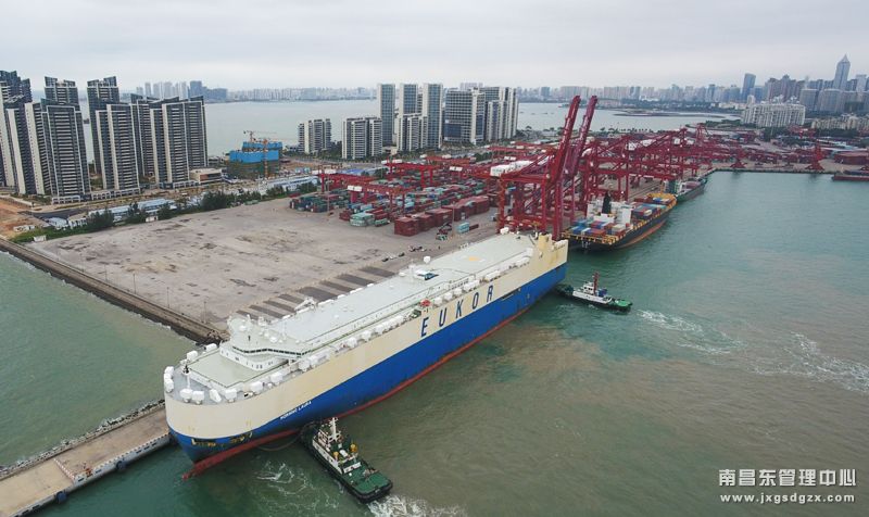 滚装货船“劳拉”轮驶入海口秀英港,这是海南自贸区政策实施以来的首艘汽车外贸船(2月16日摄,无人机照片)。新华社记者 杨冠宇 摄