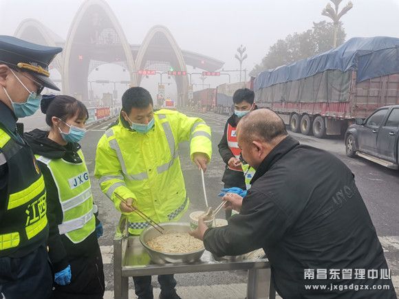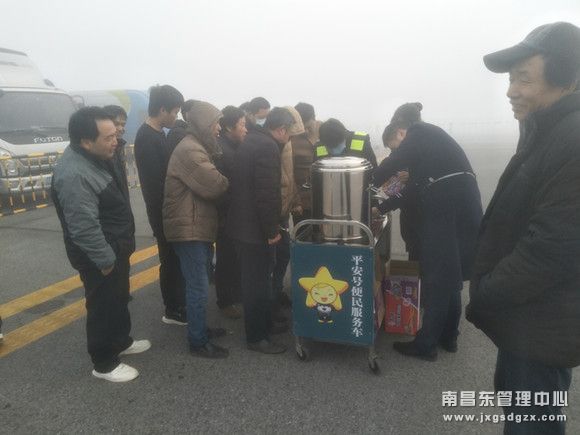 早上7时,南昌南收费站入口还未解除交通管制,而滞留的车辆和人员越来越多,由于天气还比较寒冷,考虑到大家还没有吃早饭。该站志愿者服务队推着“平安号”便民服务车走进了人流中,为滞留的司乘们送去冬日里的温暖。