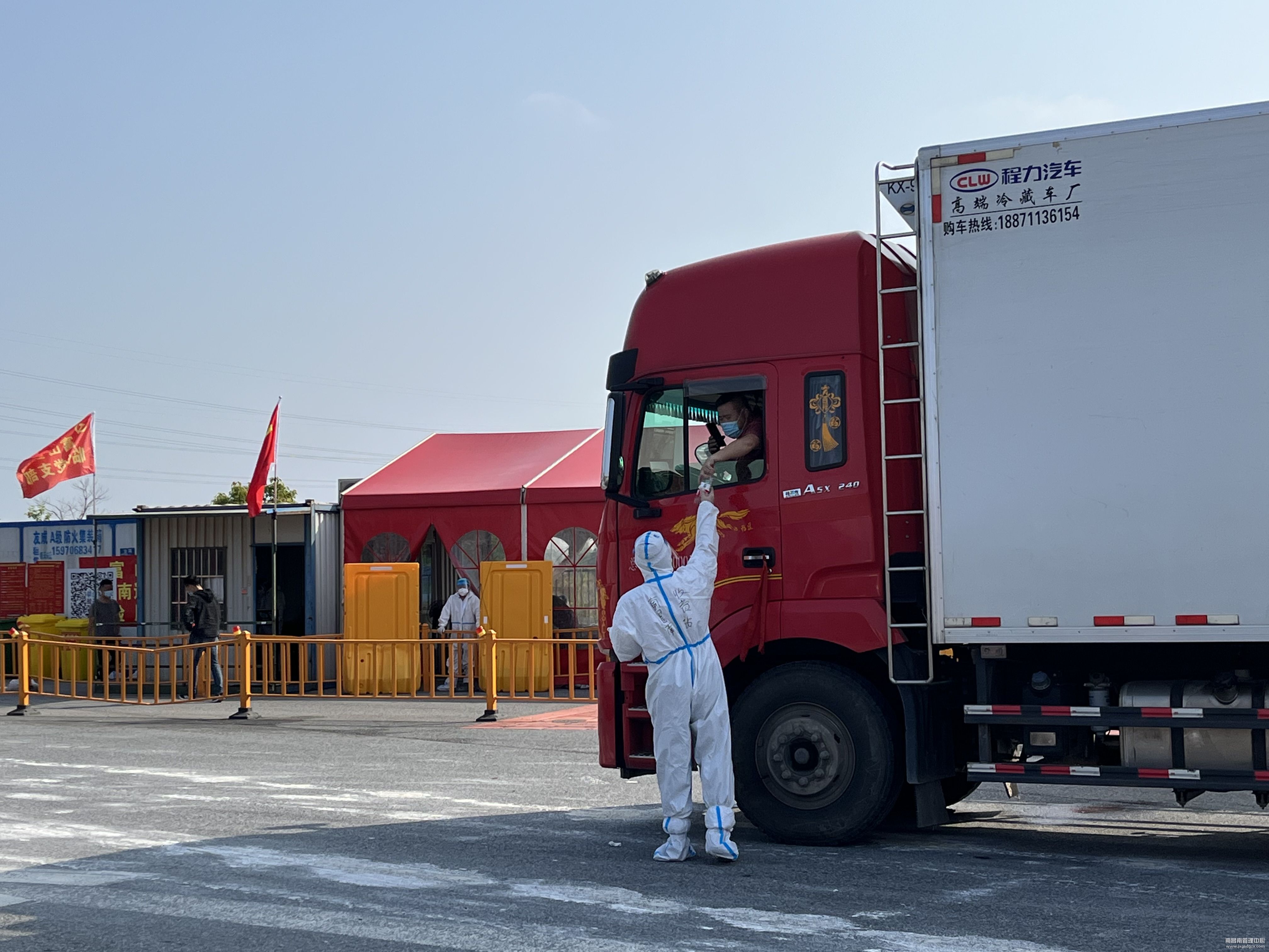 因南昌市实施静态管理,4月24日上午7时,南昌南管理中心南昌南收费站广场出口处滞留了多辆下高速货车,该站组织开展便民服务。