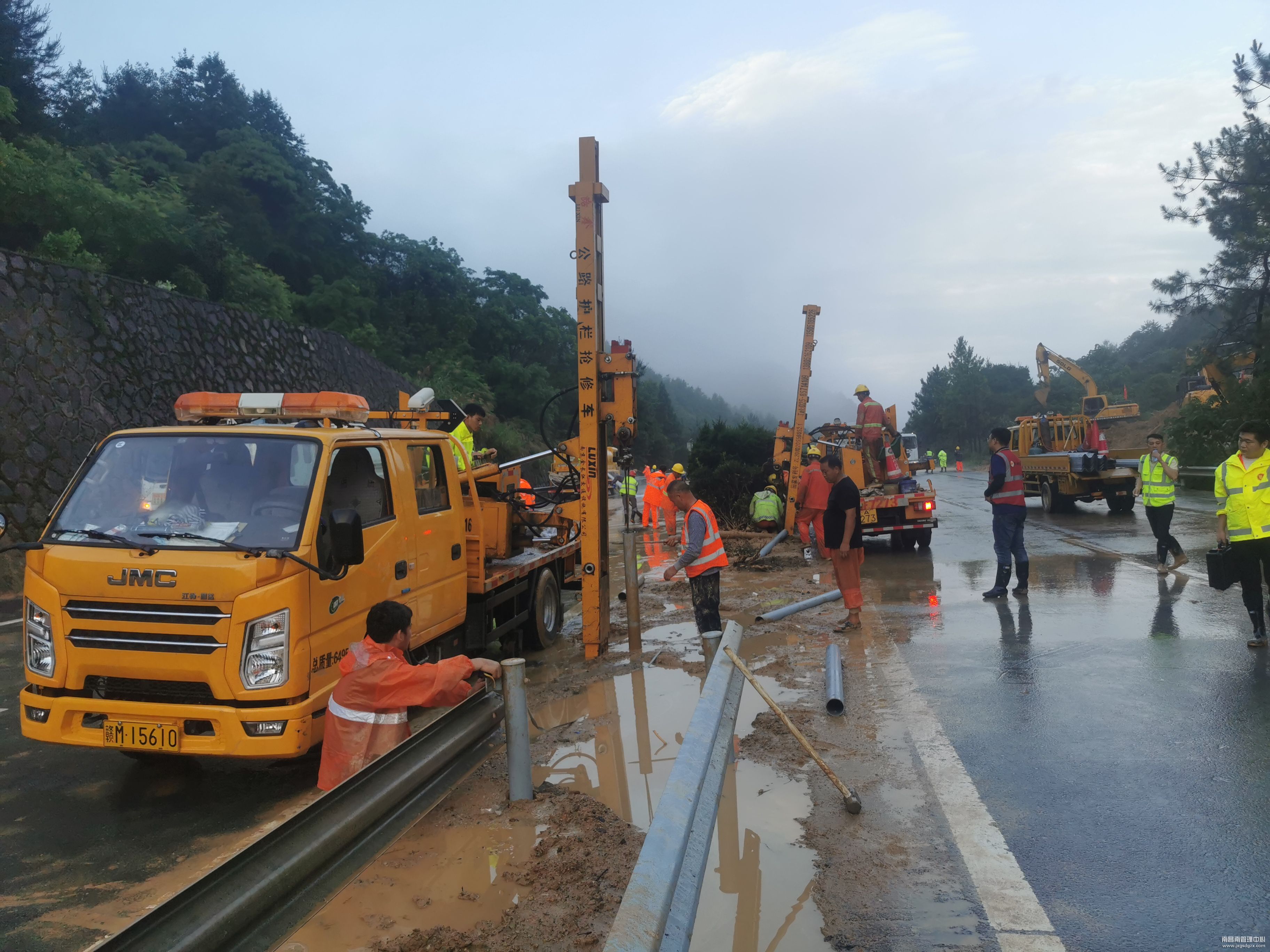 当天下午,东乡养护所交安设施维修队接到救援电话后,第一时间带领两支抢修队伍共计16人,2台打桩机,2台双排座,一台预警车等抢修设备,装满两车护栏和立柱等材料赶赴塌方现场待命,随时做好抢修恢复现场交安设施的准备。