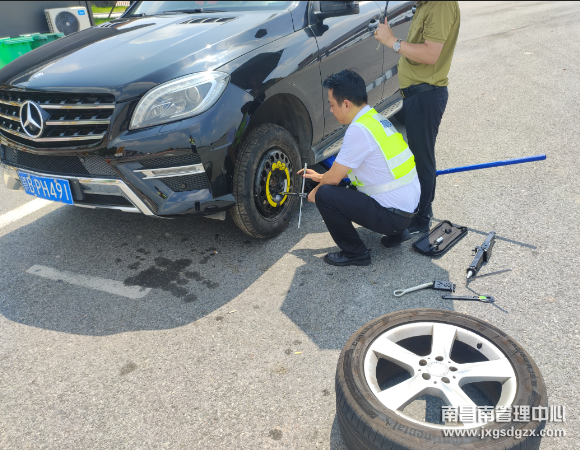 得知司机自行联系过车辆维修人员无果,南昌南收费站第一时间提供了综合服务站的维修工具,并完成备胎的更换。