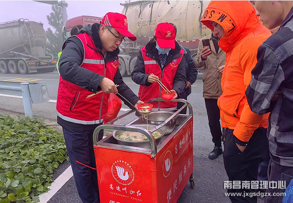 “师傅,等了一晚上了,辛苦了,吃点东西暖暖胃吧”,收费站工作人员穿梭在车队中一遍遍热心地说道,有效舒缓了司乘人员焦虑的情绪。