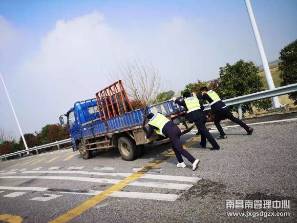 近日,一辆货车在南昌南管理中心丰城东收费站下高速匝道口抛锚,工作人员迅速出动,及时帮忙化解了险情。