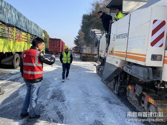 到达事故现场后,养护人员询问车主得知这种化学原料是名为水杨酸苄酯的物质,泄漏在地面后立即形成了块状胶类物质黏在路面上,会造成车辆打滑。起初使用常规的清理手段无法完成任务,连消防车水枪也冲洗不了,一时间大家对这种化学物质束手无策。经过现场勘查和分析,玉山养护站人员决定采用铣刨机设备,对路面胶装化学原料进行快速精铣刨处理。经过数小时的艰苦努力,高速公路上的化学原料终于被清理干净,随后,养护人员配合清扫车和洒水车,对铣刨处理后的路面进行彻底清扫和洒水冲洗,将残留的杂质迅速清除出车道,路面恢复了正常通行条件。在交警的指挥下,积压的车辆开始有序通过事故路段,交通秩序逐渐恢复正常。(黄杨)